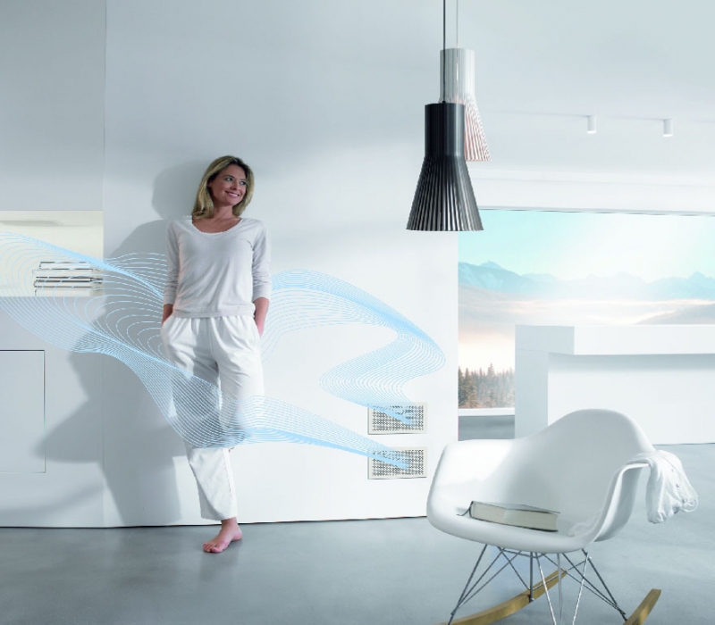 Mittels Wärmerückgewinnung aus der Abluft liefert das System gute Luft – je nach Jahreszeit – vorgekühlt oder vorgewärmt.